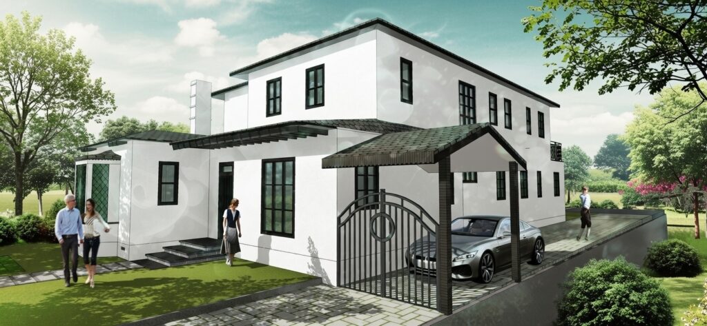 Next came materials, lighting, furniture placement, and extensive landscaping β trees, shrubs, pathways, outdoor living areas β transforming the model into a believable home environment.